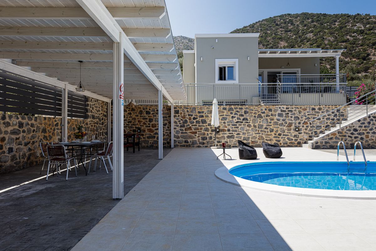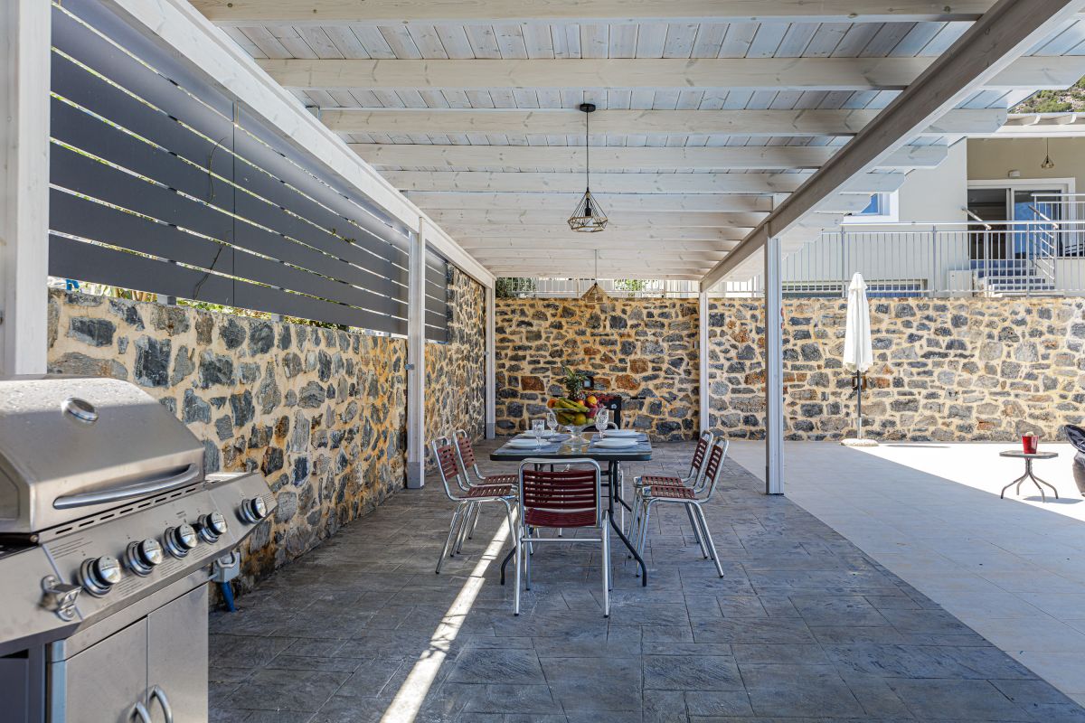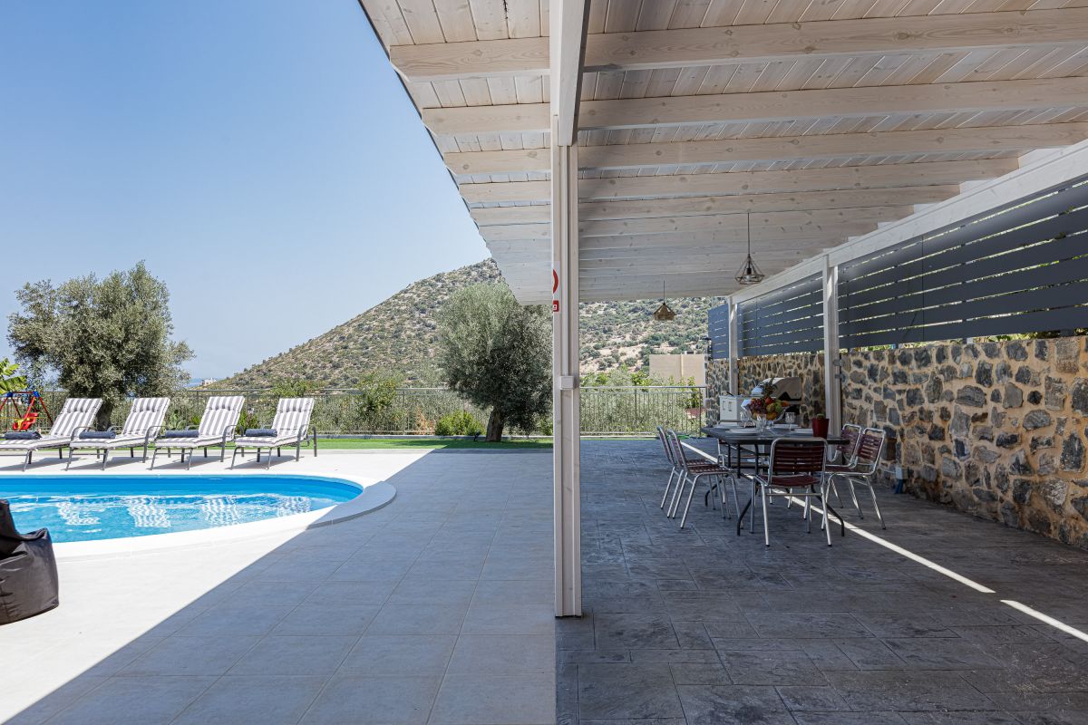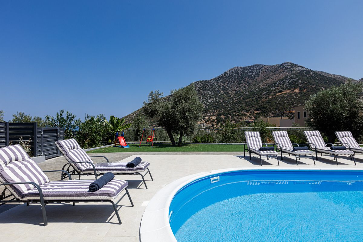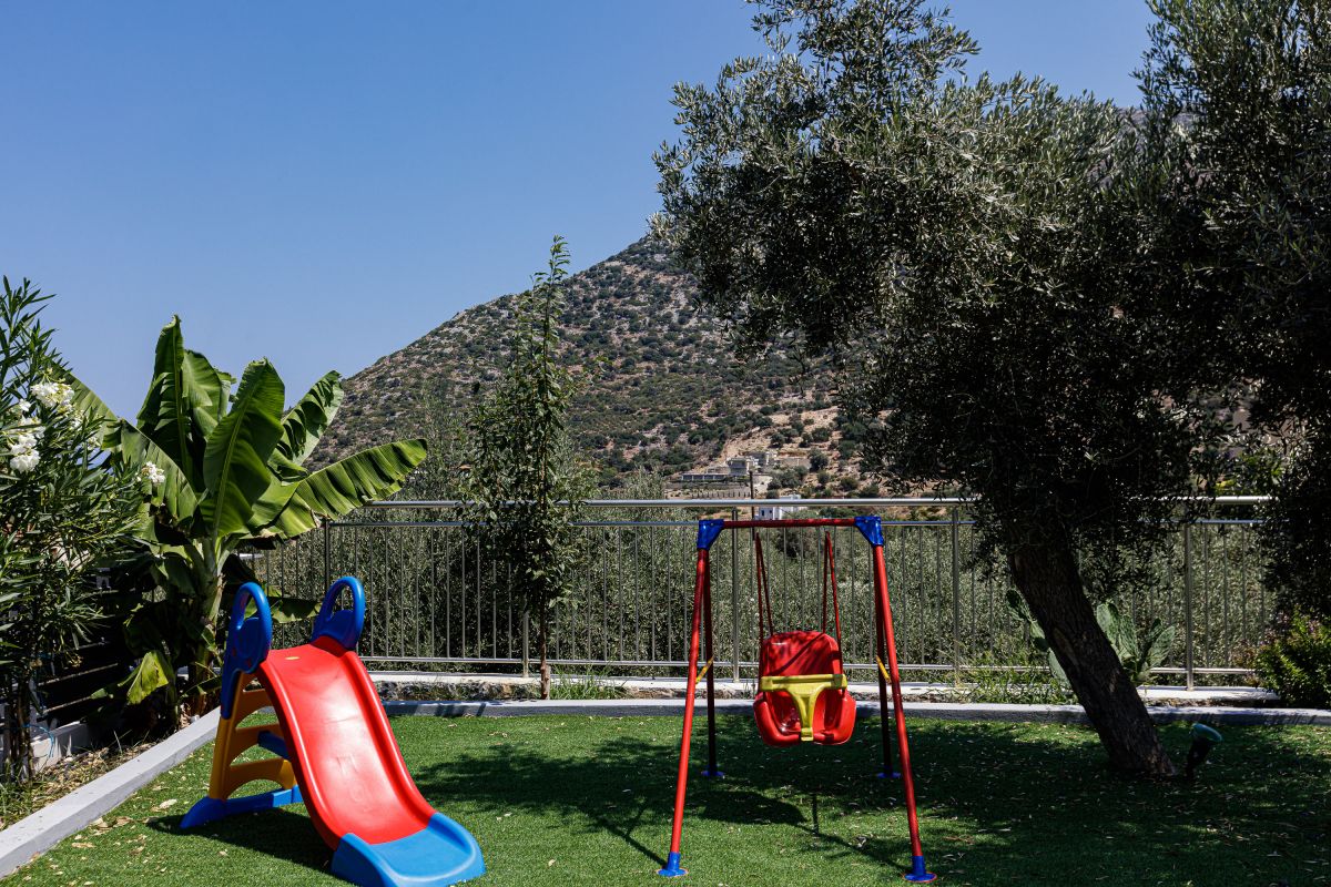 The impeccable outdoor area is host to a private swimming pool in a tranquil garden setting, perfect for families to sit back and enjoy their Crete vacation. There is a fantastic outdoor entertainment area with a gas grill BBQ and a dining area, as well as casual seating and a children’s play area, shielded by a large pergola. Furthermore, there is a football table for guests ’enjoyment while on holiday at the villa. The Crete holiday rental villa also includes parking space for 2 cars.
