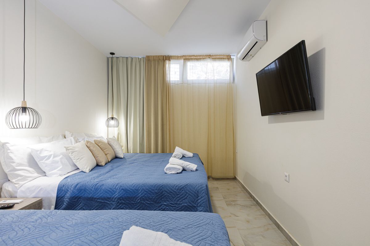 The family holiday villa is home to 2 double bedrooms and 2 twin bedrooms, with additional bedding to sleep up to 10 guests if required. All bedrooms have private balconies, air conditioning, and a safe for guests of the villa to utilize. There are 2 full ensuite bathrooms, with 2 towels per guest. Additionally, there is a cleaning service once a week, while guest amenities include a washing machine, iron, and ironing board.