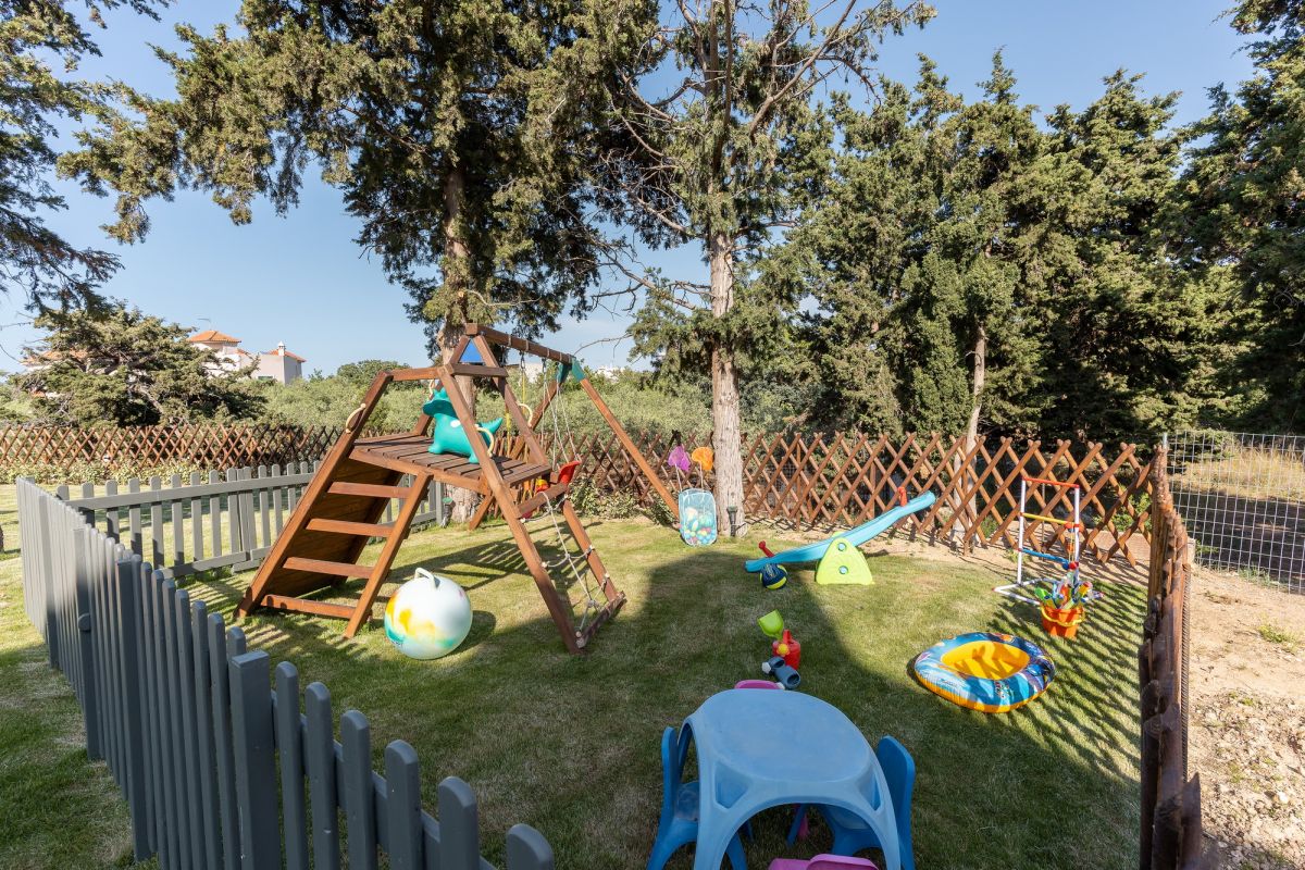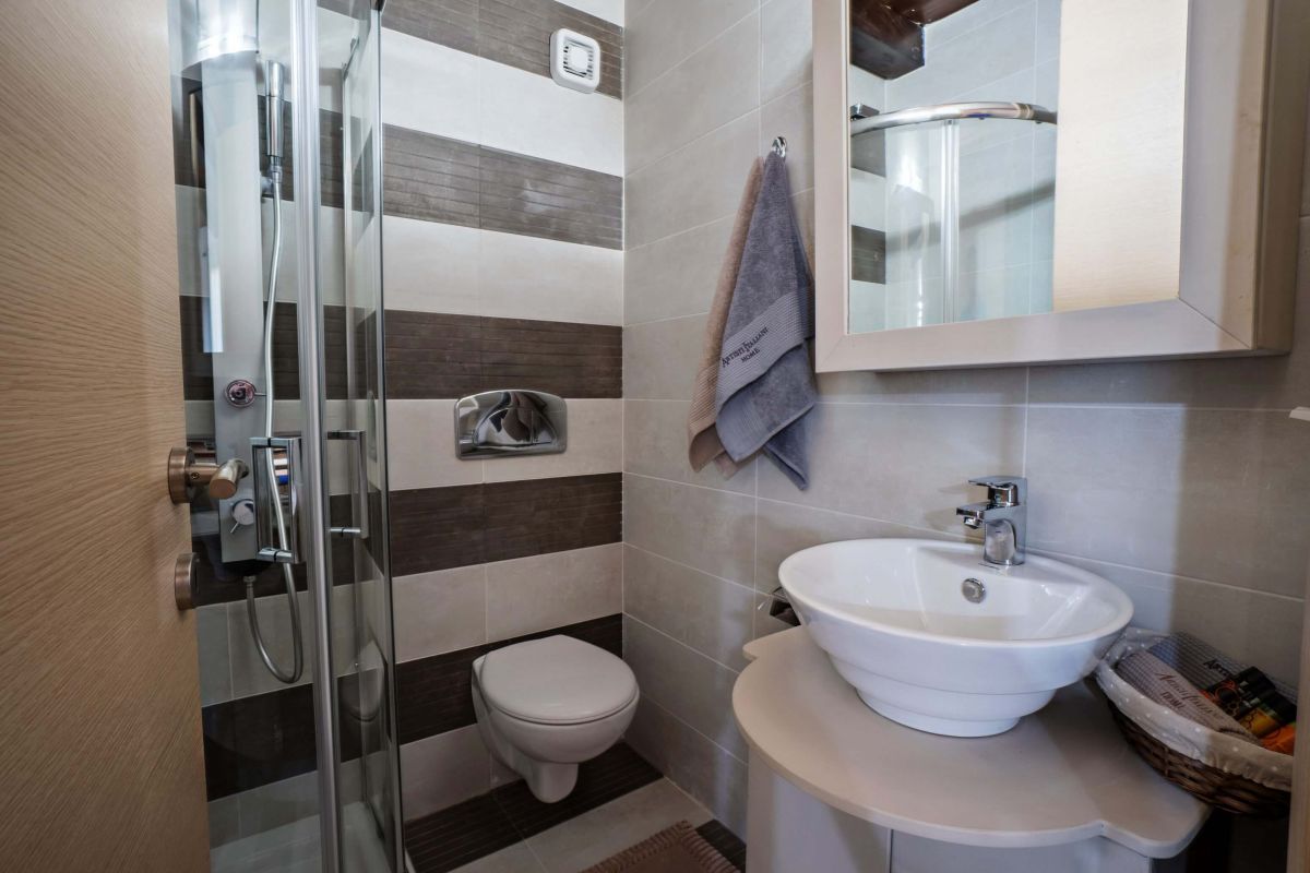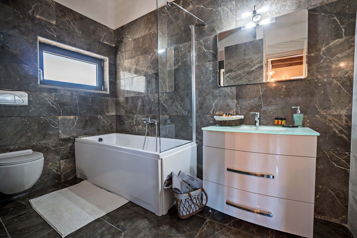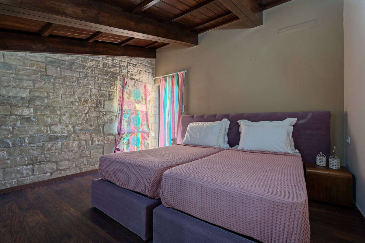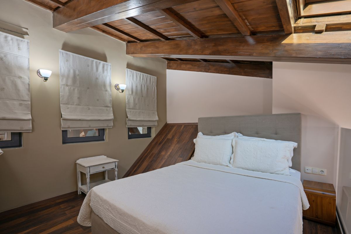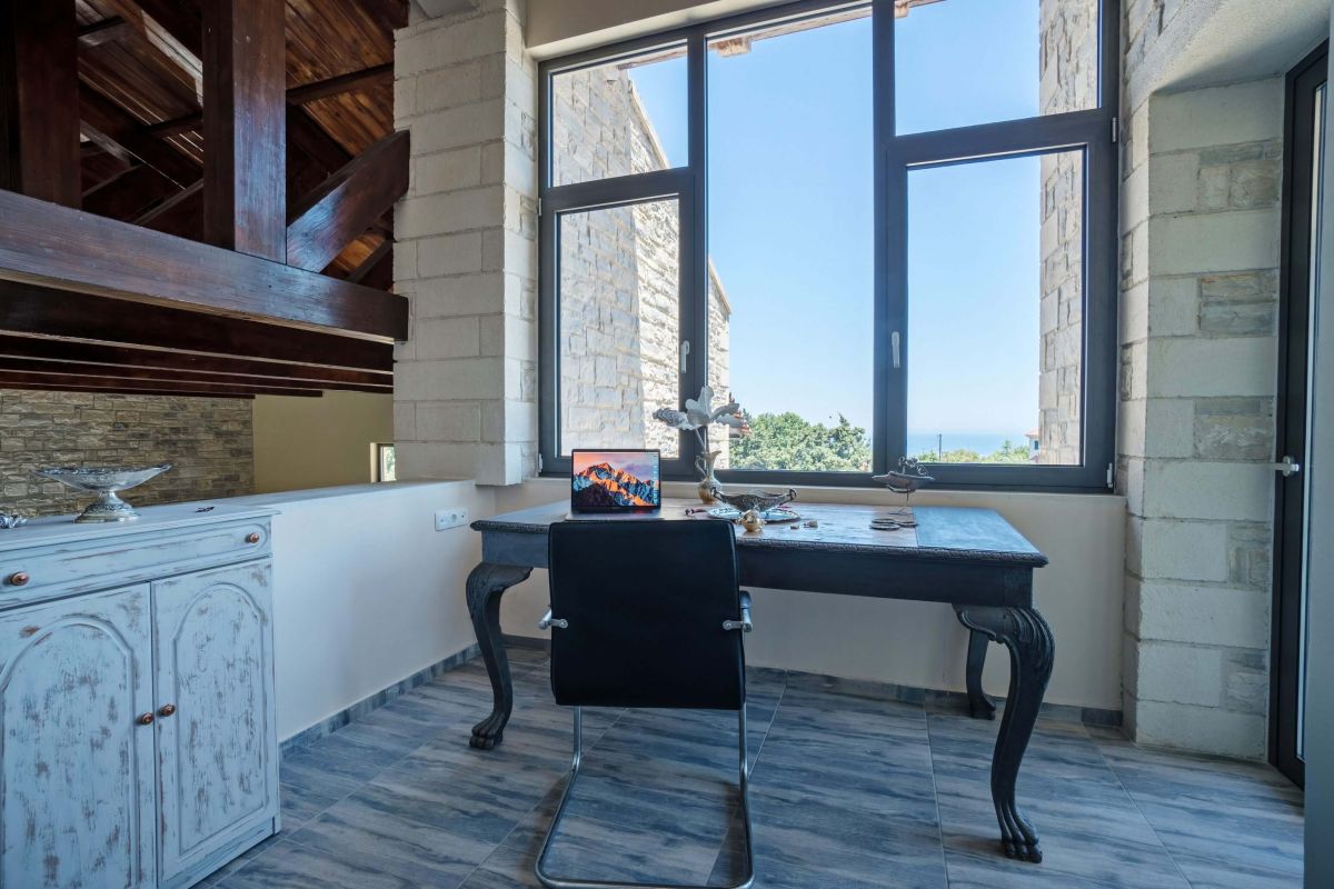 This is one of the most popular and satisfying facets of this 5 bedroom villa – the ensuite bathroom that provides guests with privacy, comfort and abundance. On the ground floor, there are two double bedrooms (one with a sofa bed that turns into double bed) with ensuite WC / showers and a shared balcony. On the first floor, there is a master bedroom with double bed, walk in wardrobe room, ensuite WC / shower and a bathtub together, a private balcony with sea views. Two more bedrooms with two floors (maisonettes), two single beds on the ground floor each, both with ensuite WC / shower and shared balcony with forest views. Moreover, one office room completes any need for business travelers.