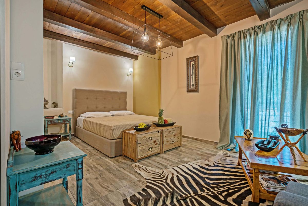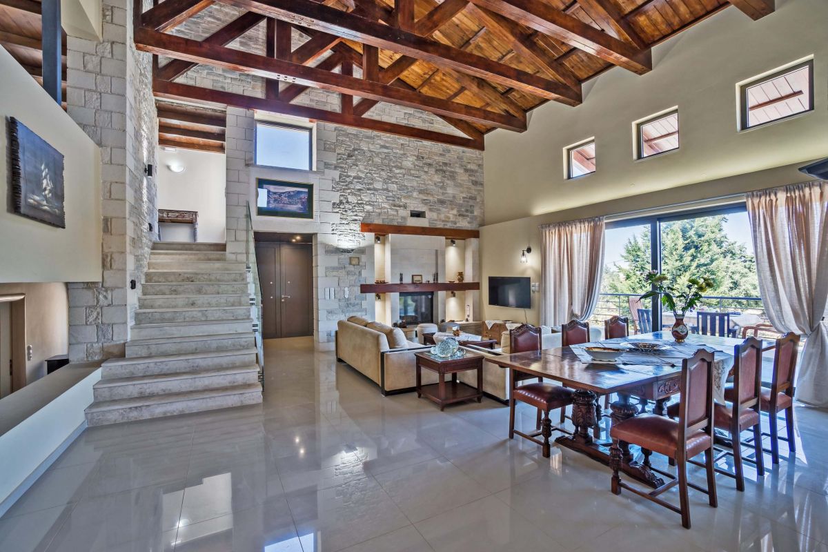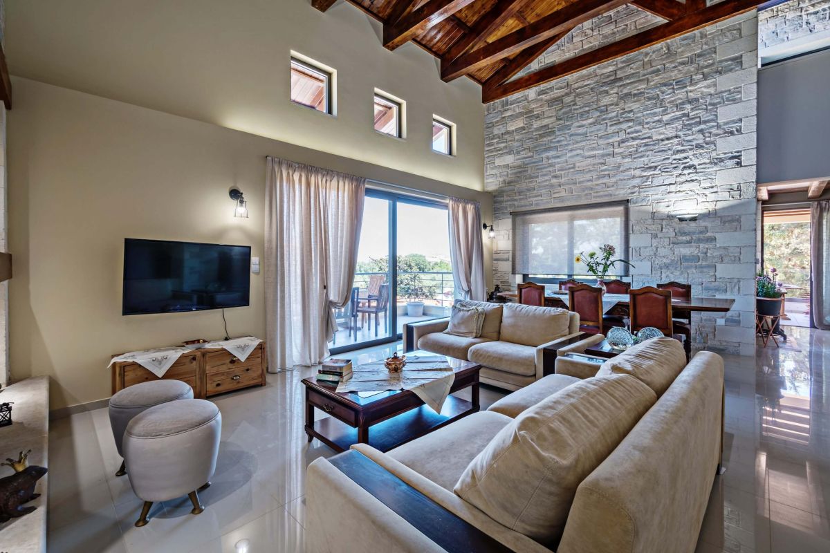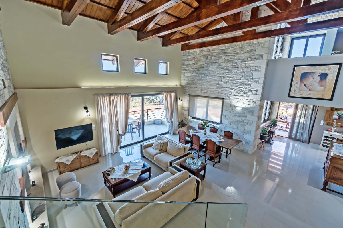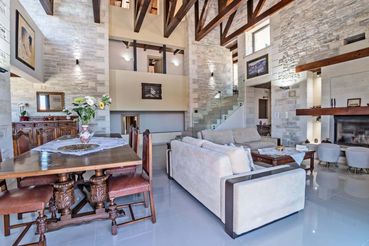 A return to tranquility and indulgence should always feel like home! This is the contemporary villa of 300sqm – ensuite bathrooms near the charming city of Rethymnon offering its temporary residences, a sense of being at home in its best version. The indigenous materials of wood and stone have been promulgated by the old wood ceiling style. Spacious living room with a view to the pool and outside area.