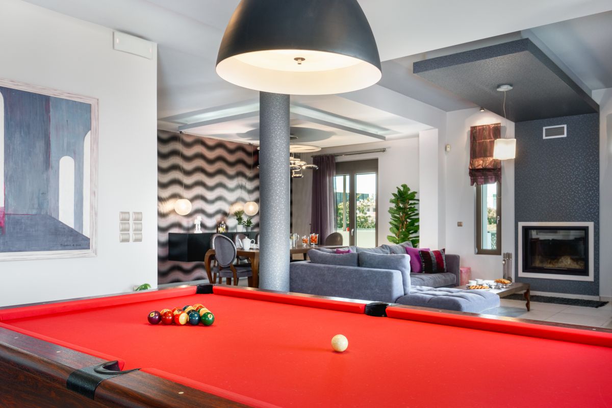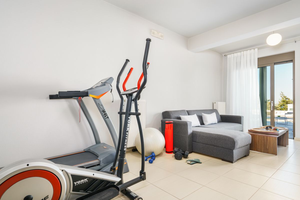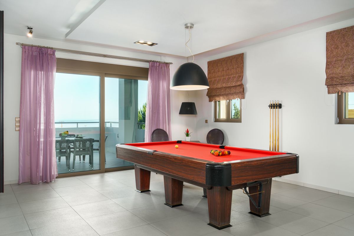 Visitors at Oak Luxury Villa are accommodated in 7 bedrooms. Entering the lower floor on the pool level you will find two double bedrooms, two bathrooms and fitness equipment. On the main floor the third bedroom is located along with a pool table and a quest bathroom. On the first floor there is the master bedroom, with a wardrobe, a TV, a safe and an ensuite bathroom, and two more bedrooms, one of them is a twin and one more bathroom. The last bedroom is located on the beautiful attic with an ensuite bathroom as well. The two extra people sleep on a sofa bed on the lower ground floor’s living room and on a folding bed.