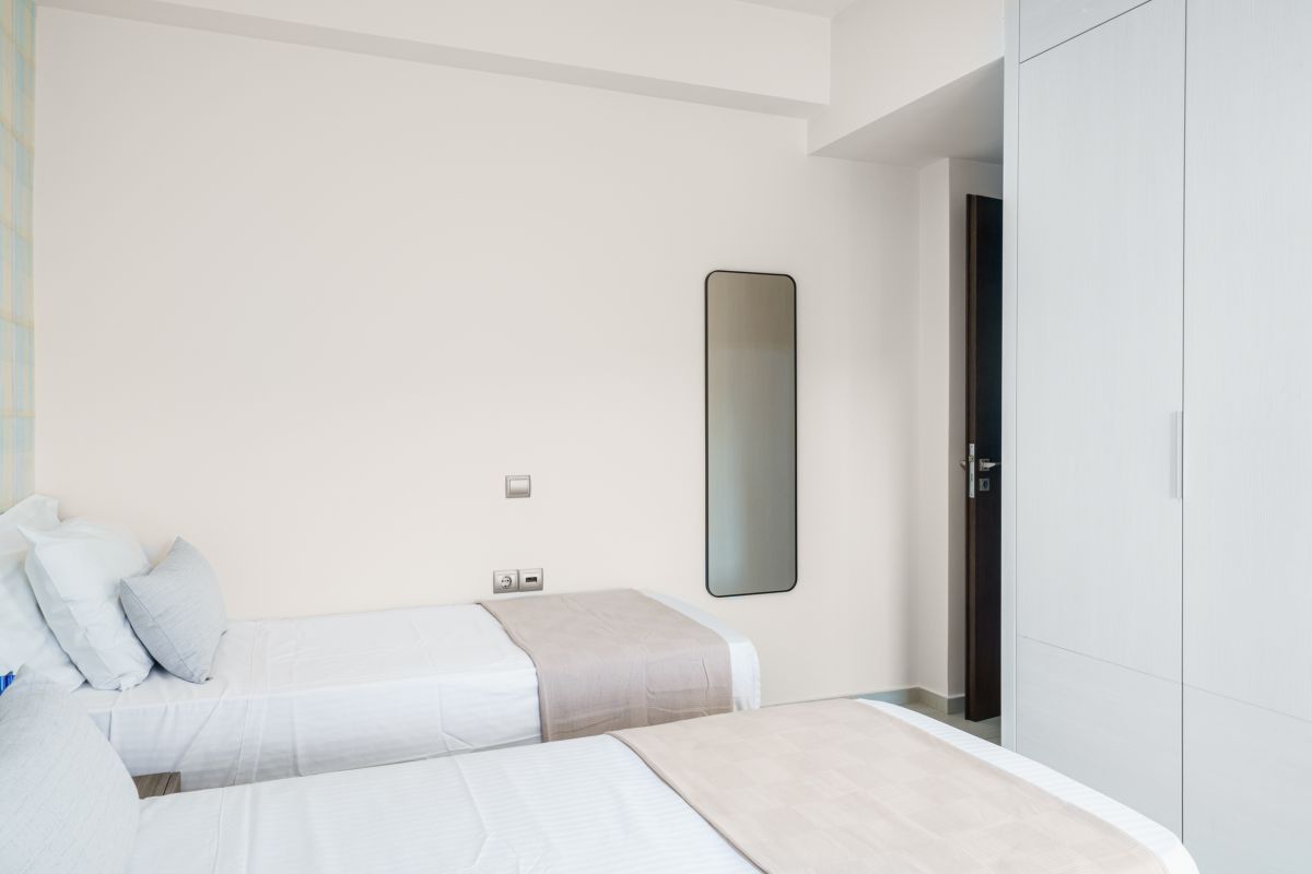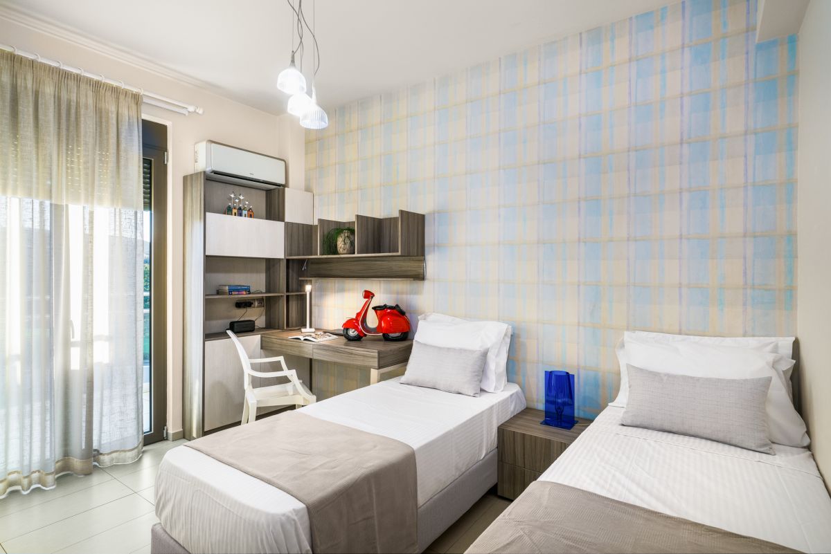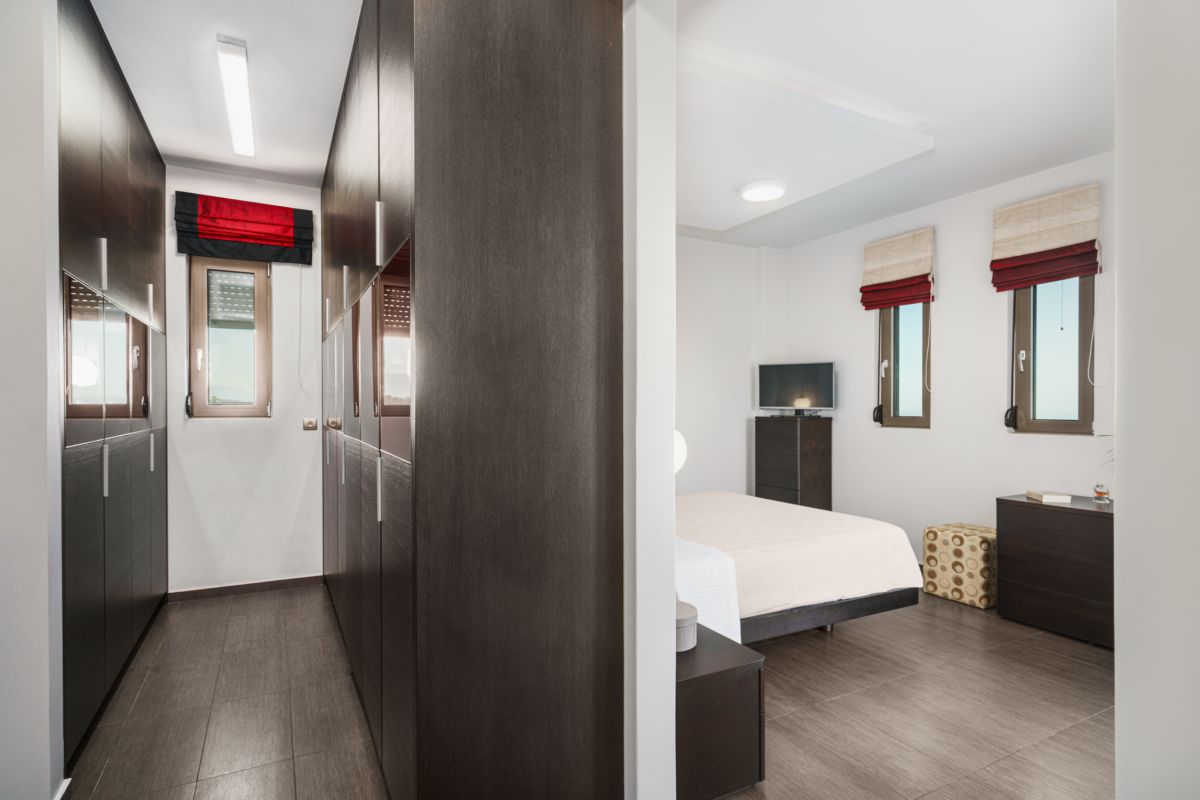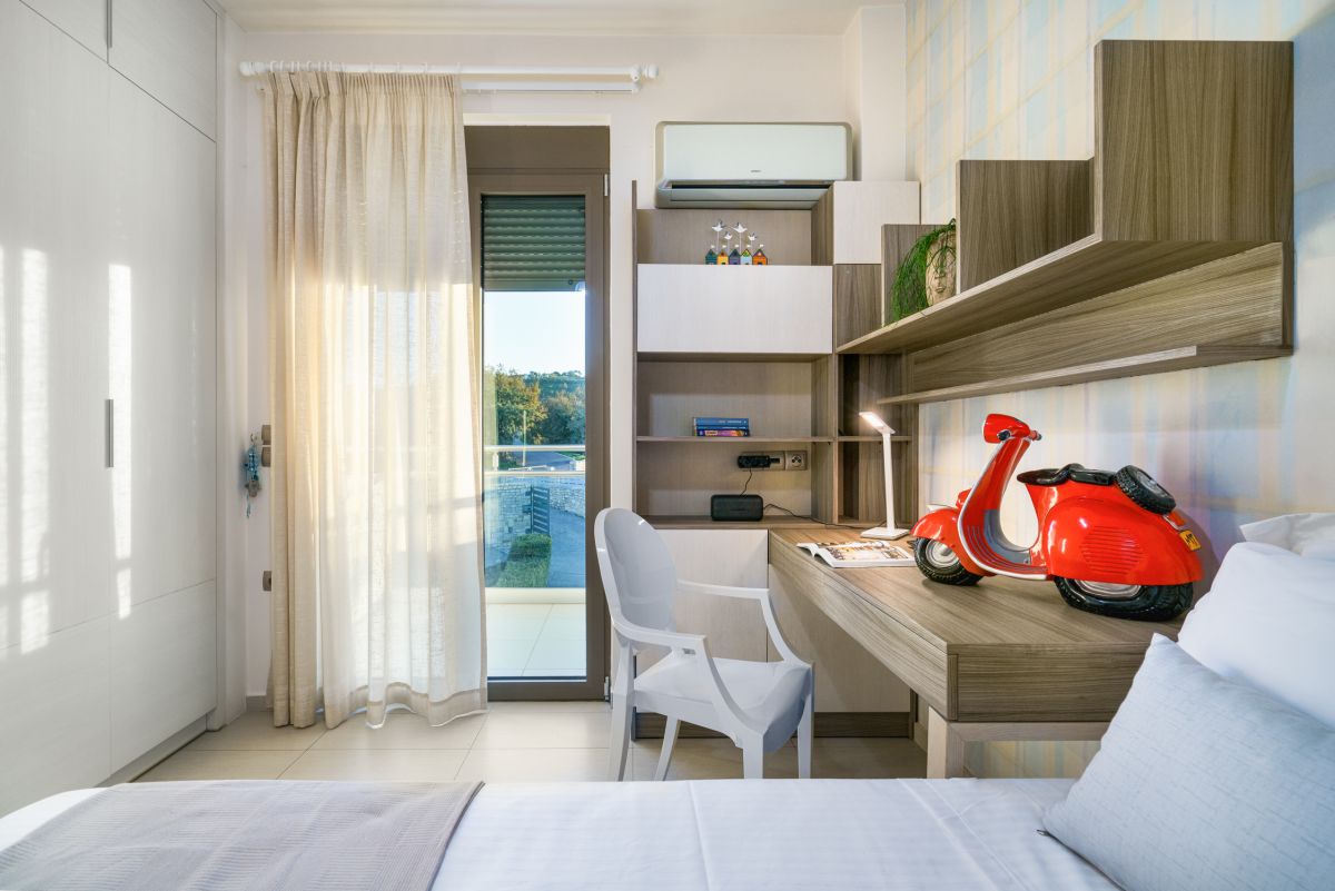 Visitors at Oak Luxury Villa are accommodated in 7 bedrooms. Entering the lower floor on the pool level you will find two double bedrooms, two bathrooms and fitness equipment. On the main floor the third bedroom is located along with a pool table and a quest bathroom. On the first floor there is the master bedroom, with a wardrobe, a TV, a safe and an ensuite bathroom, and two more bedrooms, one of them is a twin and one more bathroom. The last bedroom is located on the beautiful attic with an ensuite bathroom as well. The two extra people sleep on a sofa bed on the lower ground floor’s living room and on a folding bed.