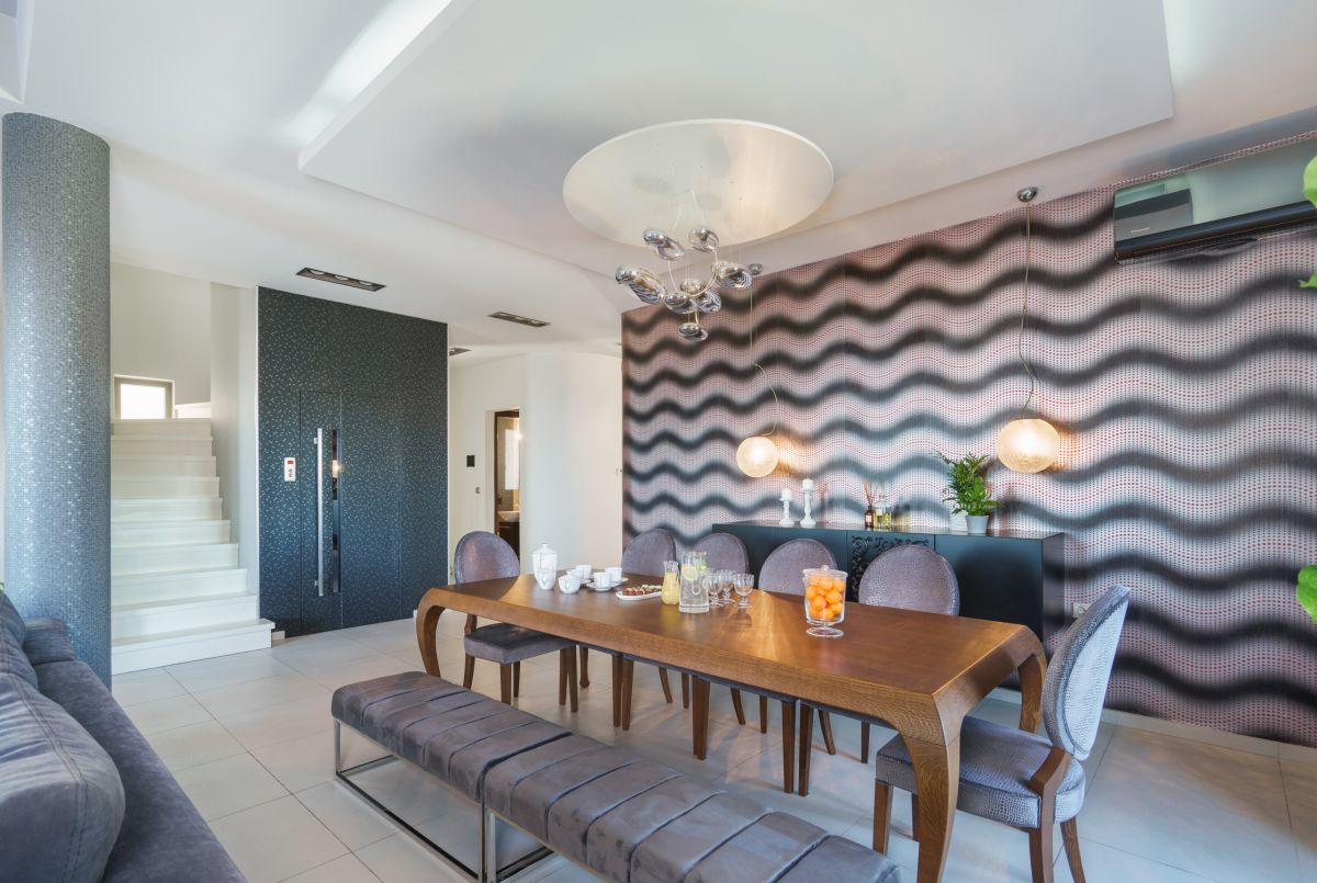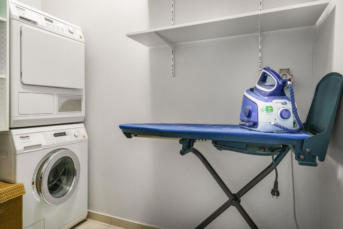 The villa has a dining room on the ground floor with ample seating and sophisticated décor. The villa’s 2 kitchens, 1 on each floor, are each equipped with an oven, dishwasher, freezer, fridge, toaster, microwave, blender, coffee machine, and Nespresso machine. There is also an ironing board, washing machine, and dryer available.