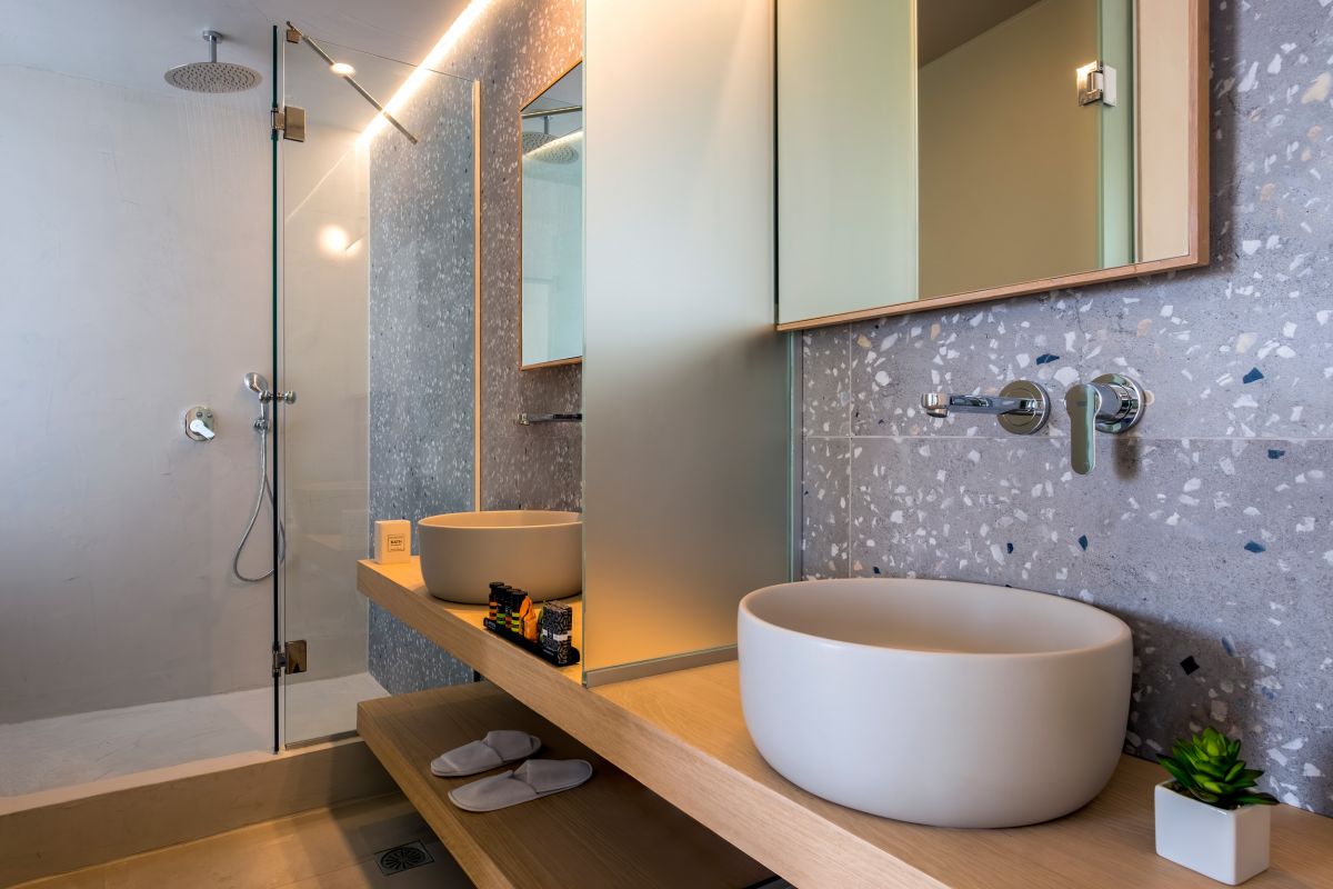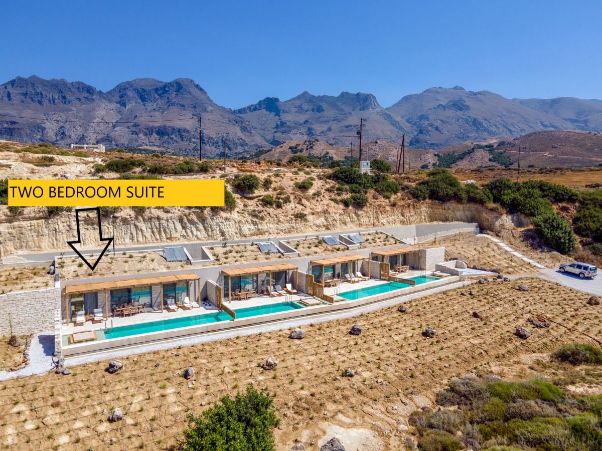 The Salvia Luxury Collection Suites are situated on Chania’s southern coastline, between Frangokastelo Sfakion and Rethymno, just meters from the beach of Lakkoi. The complex includes an exceptional, commodious suite of contemporary, luxurious, boho-chic design blending into the natural environment utilizing a cave system and endemic, native flora. The Salvia Suites 2-bedroom villa has an elegant living area, elegantly furnished with a large sectional sofa and a coffee table, as well as a 55 ”smart TV. In addition, the unit has air conditioning and a glass sliding door offering a magnificent view of the Libyan Sea. The luxury villa has a trendy open-plan lounge and kitchen area. This Salvia Luxury Collection Suite is equipped with a stylish, contemporary kitchen with a built-in oven and smooth electric stovetop, a refrigerator and freezer, as well as a Nespresso coffee machine. Additionally, the villa’s kitchen has a breakfast counter with two chairs. The private luxury villa is home to 2 double bedrooms with king-size beds and sea-facing balconies. The bedrooms are stylishly decorated and furnished with bedside tables, a desk / vanity table, occasional chairs, and ample wardrobe space. The suite also includes two sofa beds if required. The main bedroom has an ensuite bathroom, while a second bathroom is also available. The bathrooms are equipped with a shower, toilet, complimentary toiletries, towels, and hairdryers. The immaculate outdoor area boasts an infinity swimming pool with a spectacular sea view. There is a verandah with a dining area, where an outdoor table and chairs are available for guests to use. A set of comfortable sun-loungers can be found alongside the pool, its crystal-clear water sparkling in the Cretan sun. This is a fantastic area for entertaining friends or simply lying about in the fresh air and sunshine. This luxury villa rental offers a welcome pack of fruits, two bottles of wine, sliced bread, cheese, ham, coffee, local Salvia tea, honey, and butter. And, of course, every effort is made to ensure guests at the Salvia Luxury Collection Suites enjoy an exceptional Crete vacation. Important notice: – Washing machine is common for all suites and washing on request is free every Monday, Thursday, Sunday from 09:00-10:00 in the morning. – Quite hours are between 23:00 till 7:00